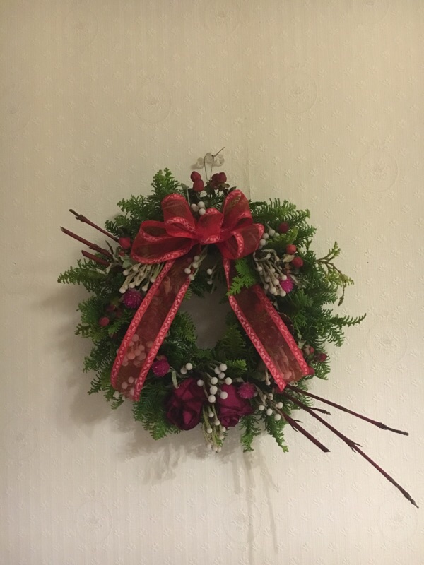 恒例の母手作りのクリスマスリースを受け取りに行ってきました。