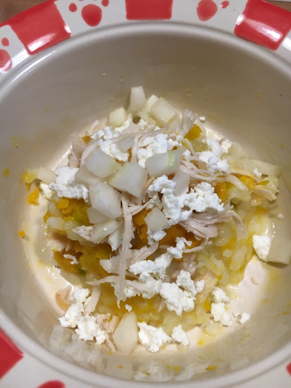 お粥50g カボチャ13g カッテージチーズ5g 胸肉10g ササミ10g キャベツ15g