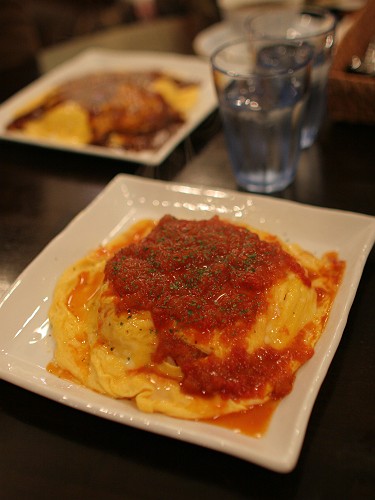 今回はおとやん「イタリアンチーズオムライス」(手前)、私「チーズデミグラスオムライス」(奥)共にドリンクセットを注文