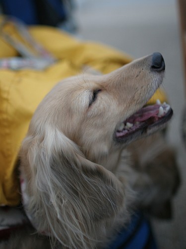 バギー乗車時、せいんの為に暖かバージョンでセッティングして乗せていると、しおんは口を開けてハァハァしてました~(笑)