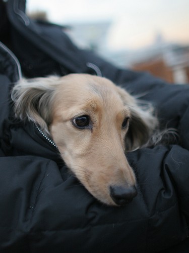 山下公園で休憩中、私のダウンに潜ってのんびりしてるかりんです。