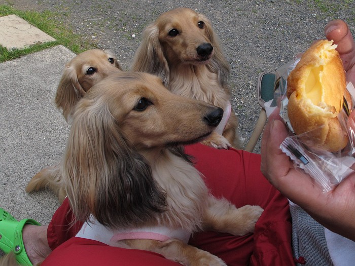 おやつにコンビニのシュークリームを買ってきてたので食べ出すとシュークリームに釘付けなかりん達(写ってないけどせいんは反対側にいます)