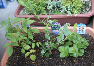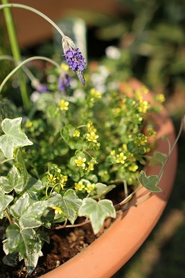 デッキ前の大きめテラコッタに先日寄せ植えしたよ♪