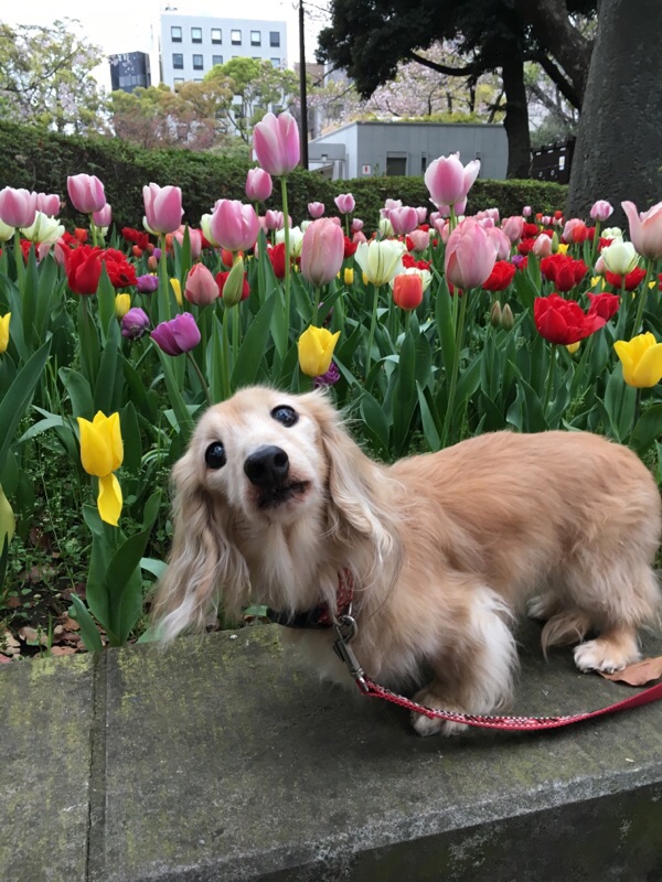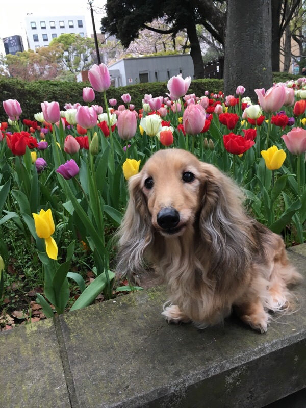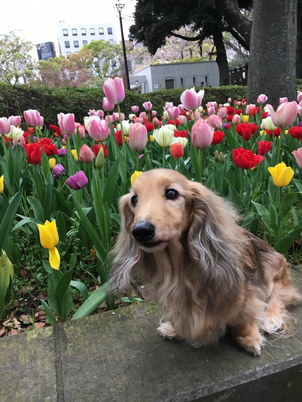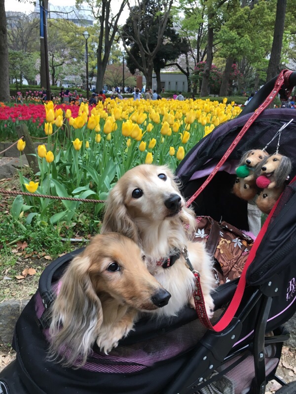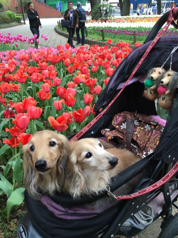 バギーから下すのが面倒で最近は乗車のままだけど、ここのチューリップは色とりどりだったので1ワンずつ撮影~