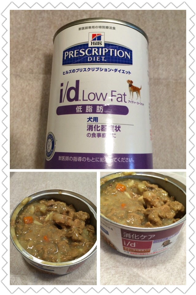 低脂肪 i/d Low Fat を1缶/日 2回に分けて食べさせる。