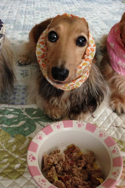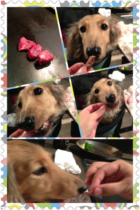 飼主の腹ごしらえの途中、サイコロステーキをかりんにあげたよ^_^