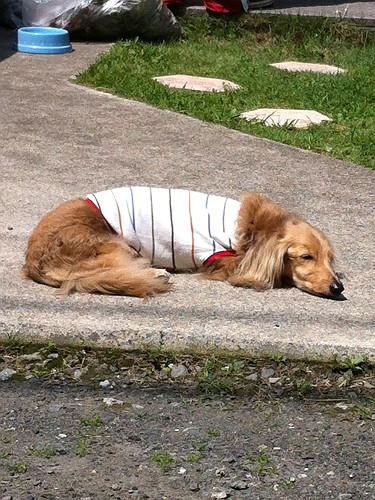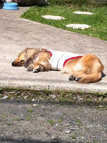 飼主もまったり中、かりんは暑いのに日当りのコンクリートの上で寝ちゃったよ
