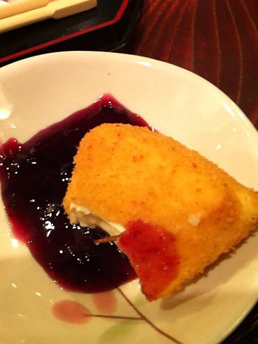 食べかけだけど、カマンベールチーズ揚げはブルーベリーをつけて食べるんだけど、これがまた意外とおいしいの(笑)