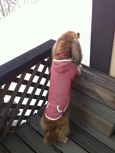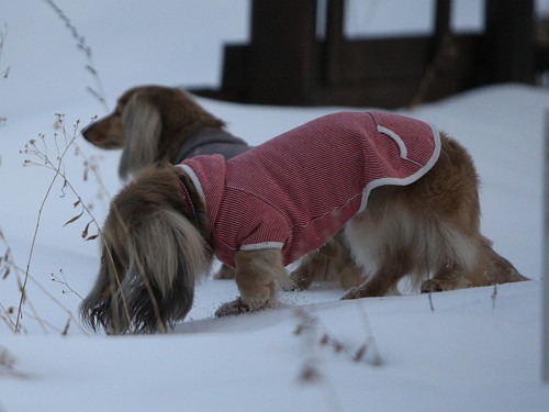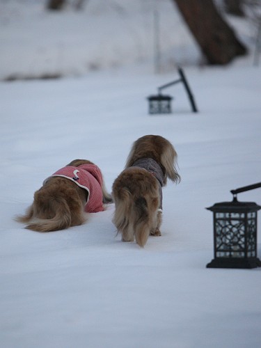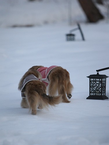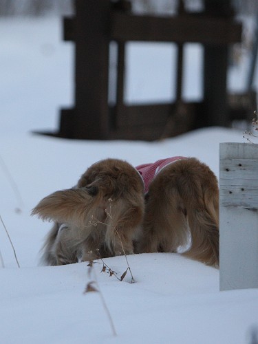 クンクンして何かの匂いを感じたのか、前足で雪を掘ろうとしてるかりん。