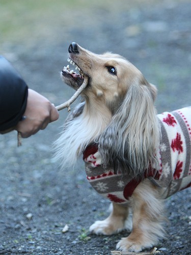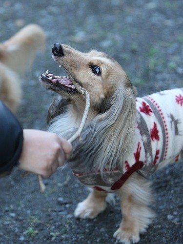 咥えたまま走られると危険なので、枝で引っ張りっ子