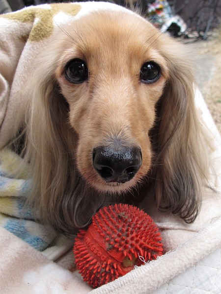 せいんは私が抱っこし、カイロを入れた寝袋に入ったままボールを食み食み