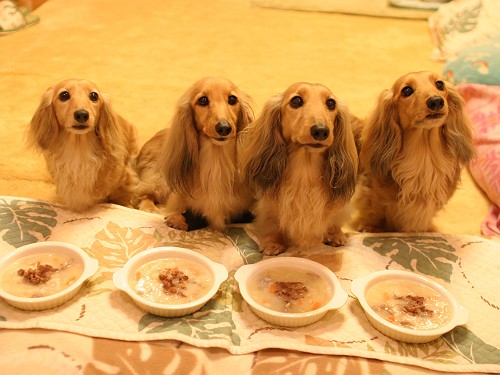 お疲れのかりん達のご馳走はお腹に優しいお粥さんにしました。