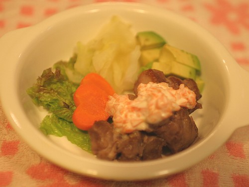 ボイル野菜とアボカド、お肉にはにんじんヨーグルトソースがけ。